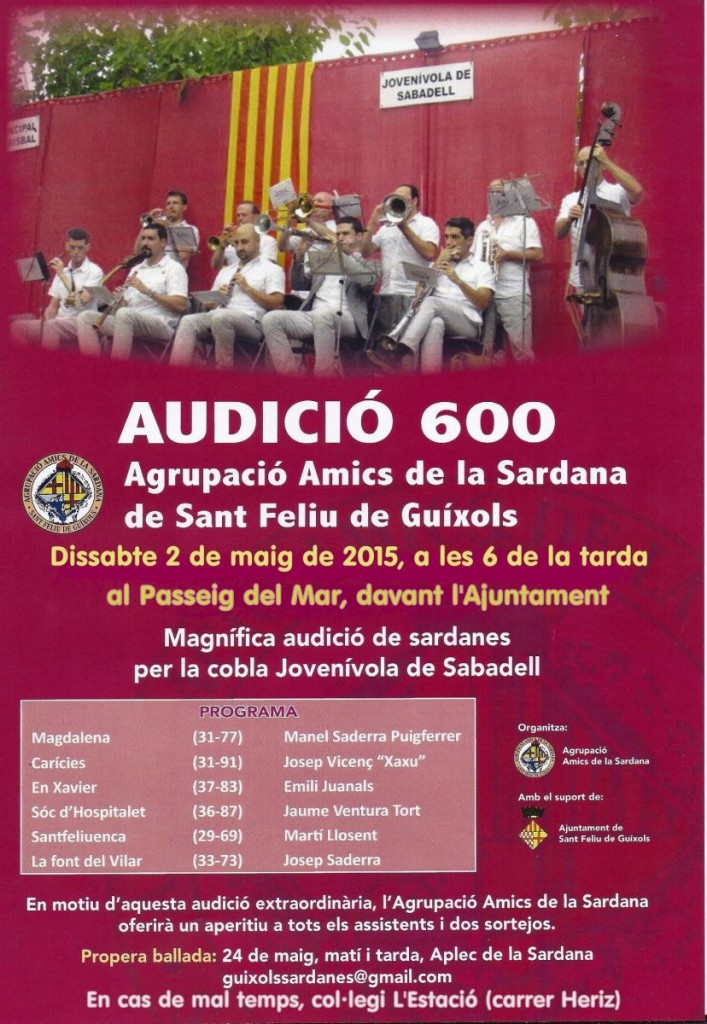L’Agrupació d’Amics de la Sardana de Sant Feliu de Guíxols celebrarà aquest dissabte 2 de maig a les 6 de la tarda, al Passeig del Mar davant l’Ajuntament, l’audició de sardanes número 600. Un número rodó per aquesta veterana associació de la ciutat.
