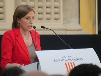 La Presidenta Carme Forcadell, durant l’acte de retorn de la senyera de Rafael Patxot a la ciutat. La Molt Honorable va incidir, sota l’atenta mirada de l’alcalde de la ciutat Carles Motas, en què cal estar alerta amb els comportaments feixistes a les nostres vides, no tan sols en els grans líders polítics, sinó a petita escala.
