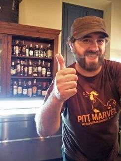 Agus Segura, rere la barra de Cas Romagué i amb una samarreta reivindicativa de la cultura ganxona: el grup de rock Pitt Marvel.