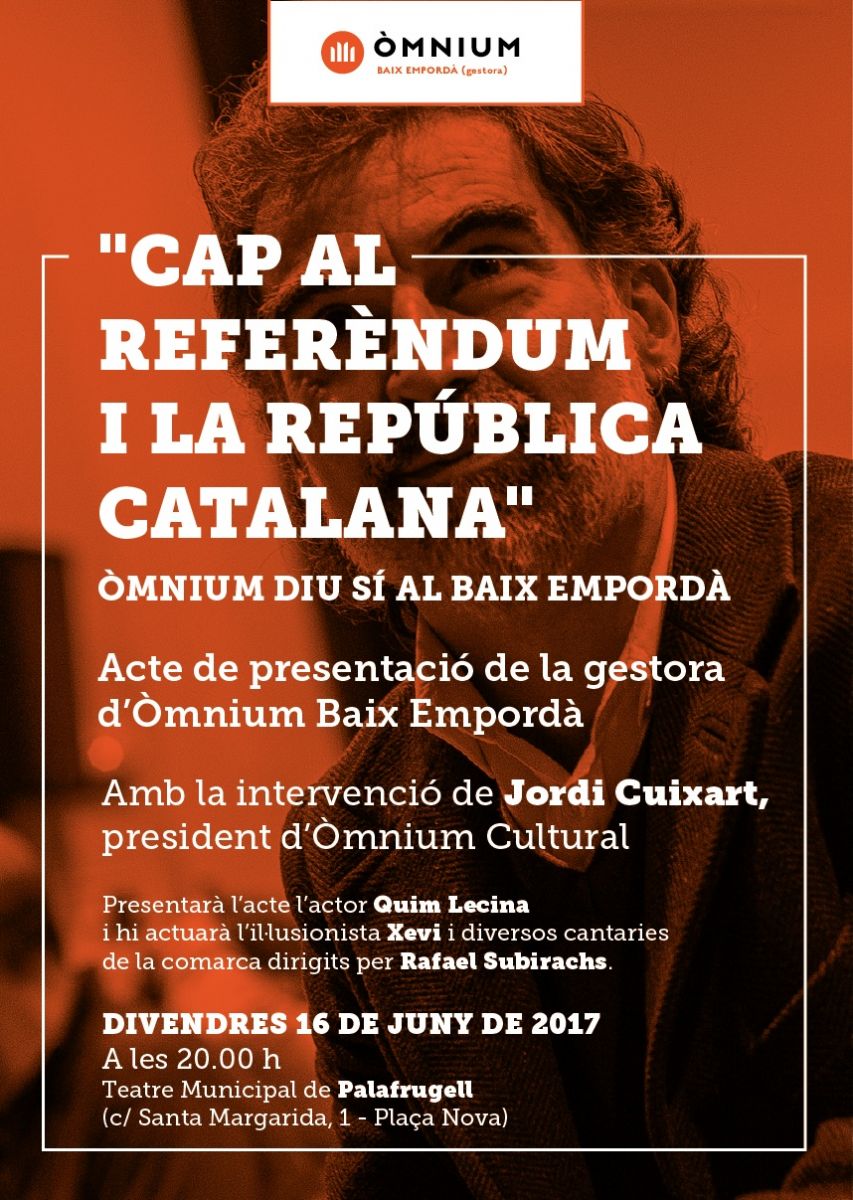 La presentació de la gestora tindrà lloc el divendres 16 de juny, a les 8 del vespre, al Teatre Municipal de Palafrugell, i comptarà amb l’assistència del president de l’Entitat, Jordi Cuixart, que junt amb el presentador Quim Lecina, explicaran el nou projecte a la comarca. En l’acte hi haurà també les actuacions de corals del Baix Empordà dirigides per Rafael Subirachs i de l’il·lusionista Xevi.