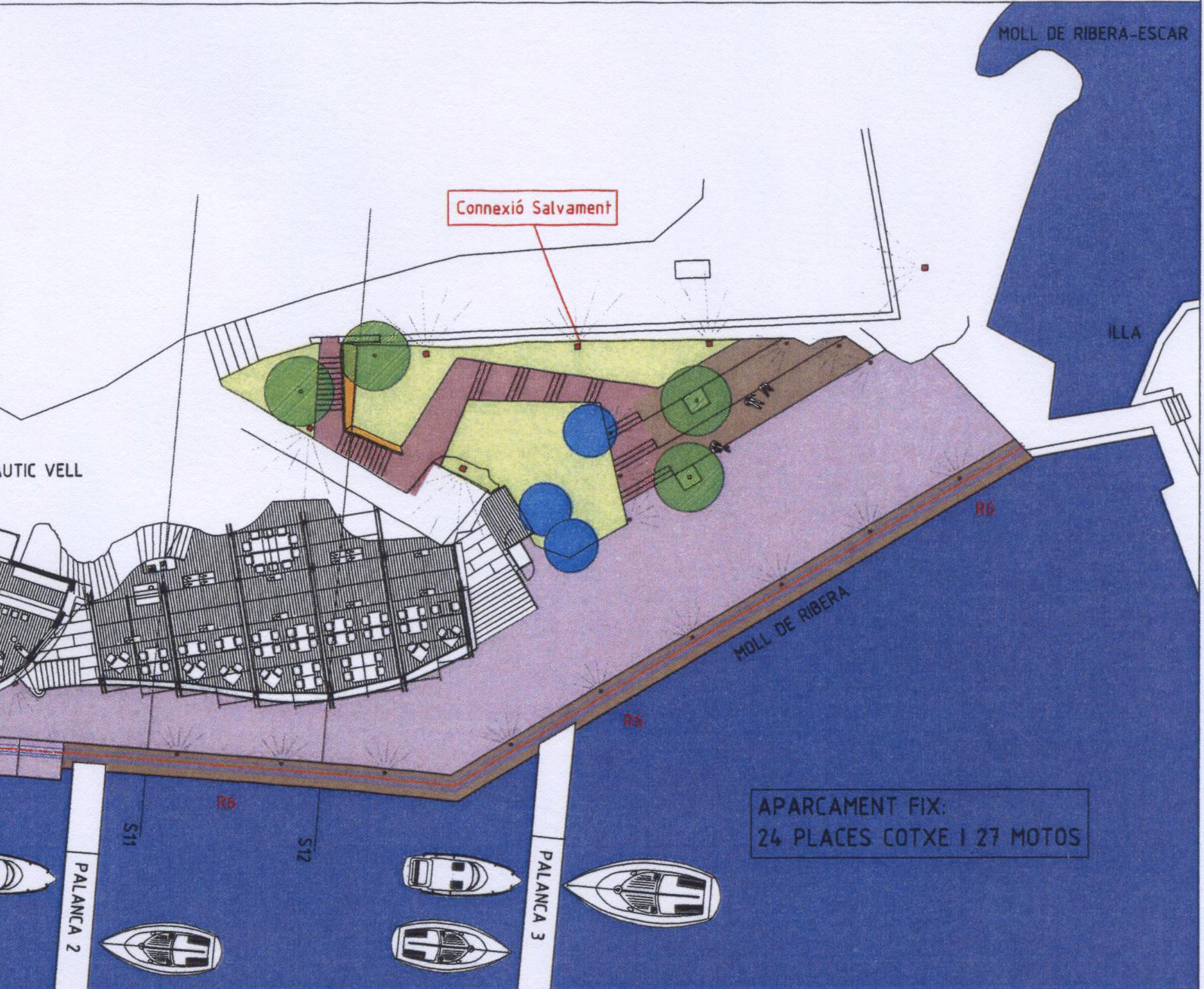 Darrerament, en les obres de millora de l’espai del nàutic vell, a sota del Salvament, s’estan fent unes obres que pretenen construir una escala adossada (literalment enganxada) a aquest moll, que puja fins l’esplanada superior, amb una rampa que tapa la meitat de la paret del costat de llevant.