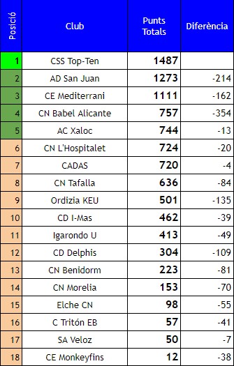El millor va ser el CSS Top-Ten d’Alacant, amb un total de 1.487 punts, seguit de l’AD San Juan de Pamplona, amb 1.273 punts, CE Mediterrani de Barcelona, amb 1.111 punts, el CN Babel d’Alacant, amb 757 punts i cinquè l’AC Xaloc de Sant Feliu de Guíxols, amb 744 punts.