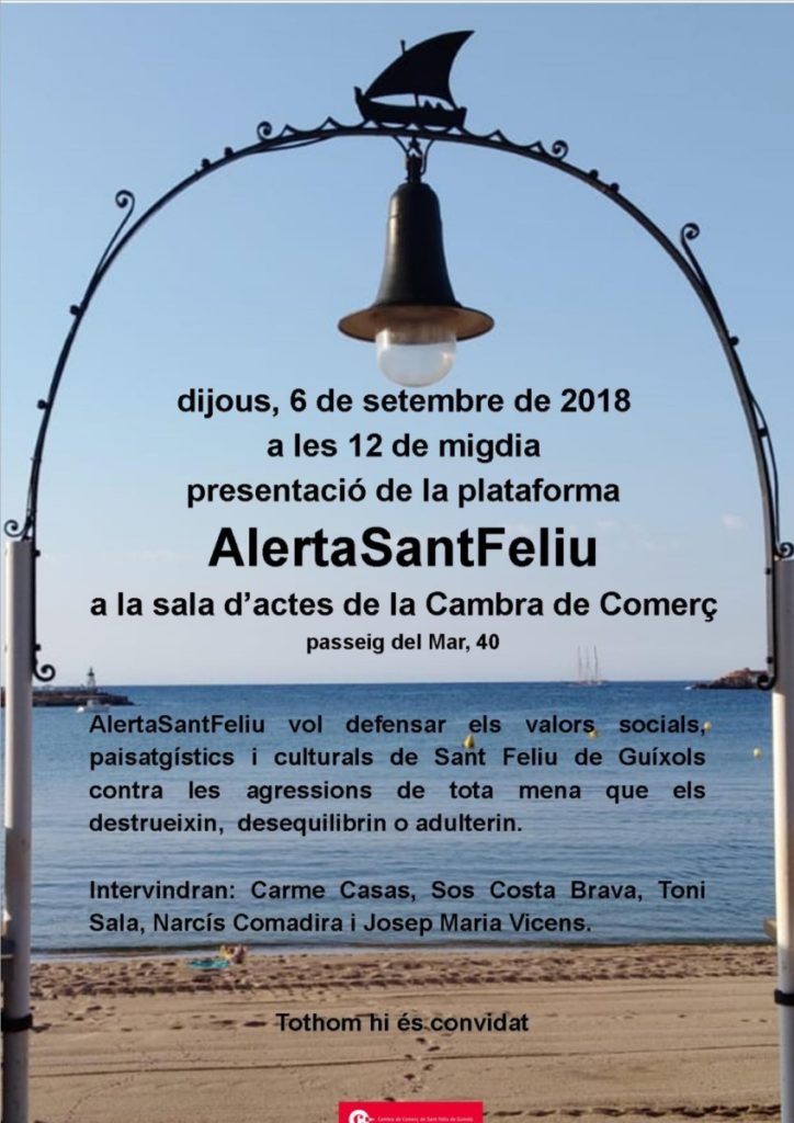 AlertaSantFeliu explicarà amb detall aquestes qüestions i les actuacions previstes en la presentació que farà dijous 6 de setembre al migdia a la Cambra de Comerç, en què els assistents seran convidats a una visita in situ als llocs afectats.