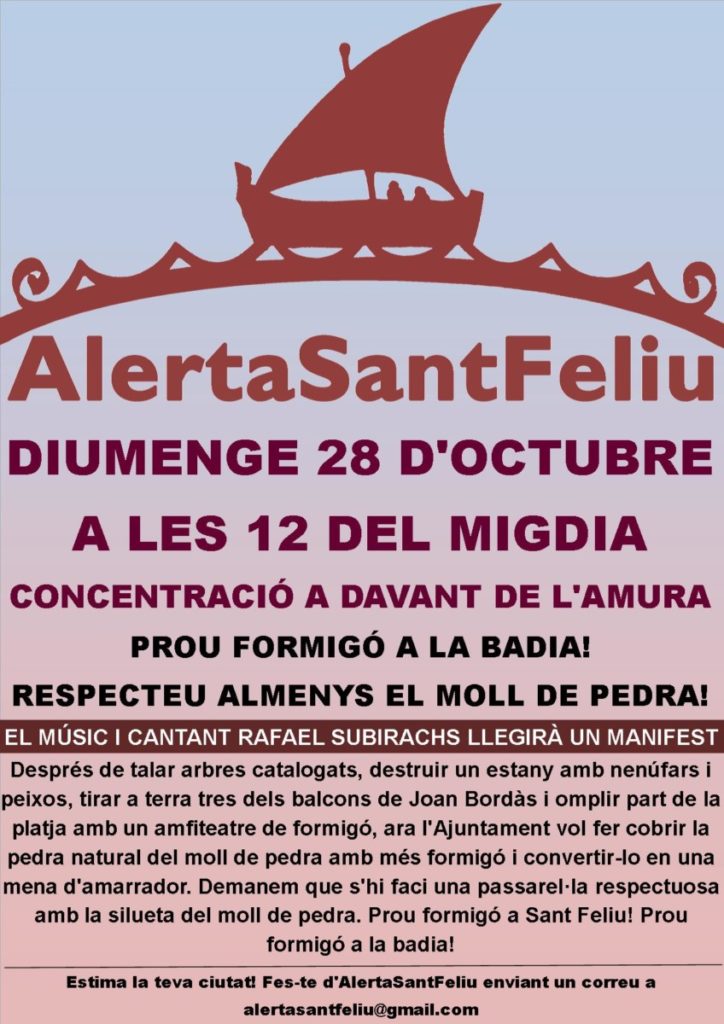 A la convocatòria, a les 10 del mati al Moll de Pedra, s’afegeixen altres queixes contra les actuacions de l’ajuntament en els darrers temps: la tala d’arbres catalogats, la destrucció de l’estany que albergava l’escultura Costa Brava, la desaparició dels balcons ideats per Joan Bordàs de cara al mar o la manca de respecte per la muralla i el moll medieval per la construcció d’una escala des del fortí fins al club nàutic del Racó de Llevant.